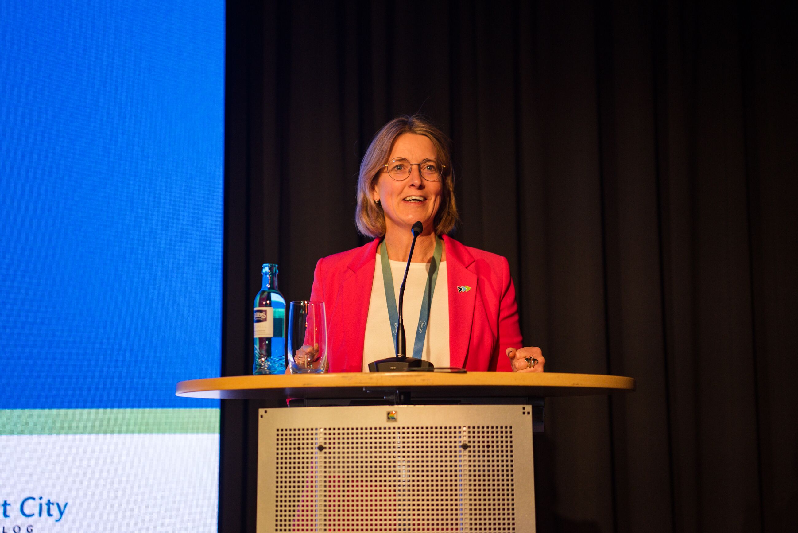 Ulrike Wielatt, Geschäftsführerin der KielRegion GmbH, zeigte eindrucksvoll, wie Kooperation in der KielRegion gelebt wird. Das Modellprojekt Smart Cities SmarterLeben | KielRegion und der gerade entstehende interkommunale Verbund „Smarter Norden“ (SmarterLeben | KielRegion, Smart City Amt Süderbrarup, Smarte Grenzregion und Smart City Lübeck) bewiesen, dass Digitalisierung dort am stärksten wirke, wo Stadt und Land gemeinsam denken.