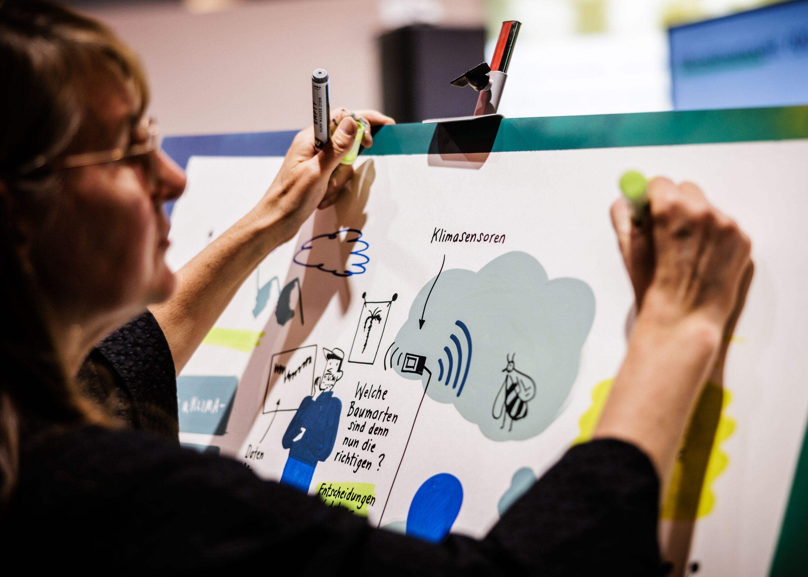 Die Graphic Recorderin Anne Lehmann hat das Standprogramm am BMWSB-Stand zeichnerisch dokumentiert.