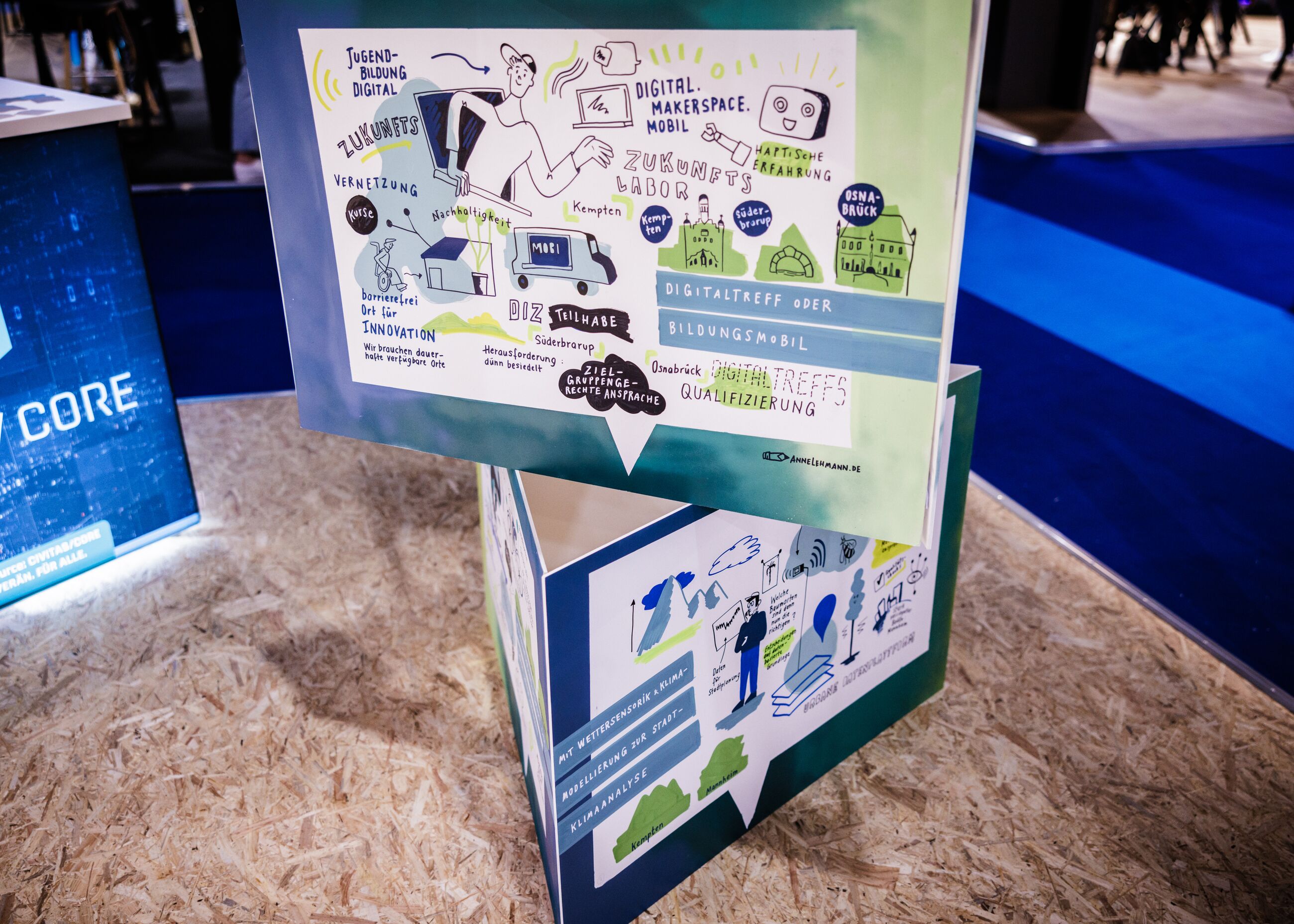 Unter dem Motto „Abschauen erwünscht!“ konnten Besucherinnen und Besucher erleben, wie smarte Lösungen für Stadtentwicklung, Datenmanagement und Mobilität funktionieren: Am Stand des Bundesministeriums für Wohnen, Stadtentwicklung und Bauwesen (BMWSB) präsentierten unter anderem ausgewählte Modellprojekte Smart Cities (MPSC) praxisnahe Beispiele aus den Kommunen. Viele ihrer Lösungen sind inzwischen so ausgereift und erprobt, dass diese von anderen Kommunen übernommen werden können. Ein besonderes Highlight war das Graphic Recording von Anne Lehmann, das die Vielfalt der digitalen Smart-City-Lösungen in analogen Bildern illustrierte.