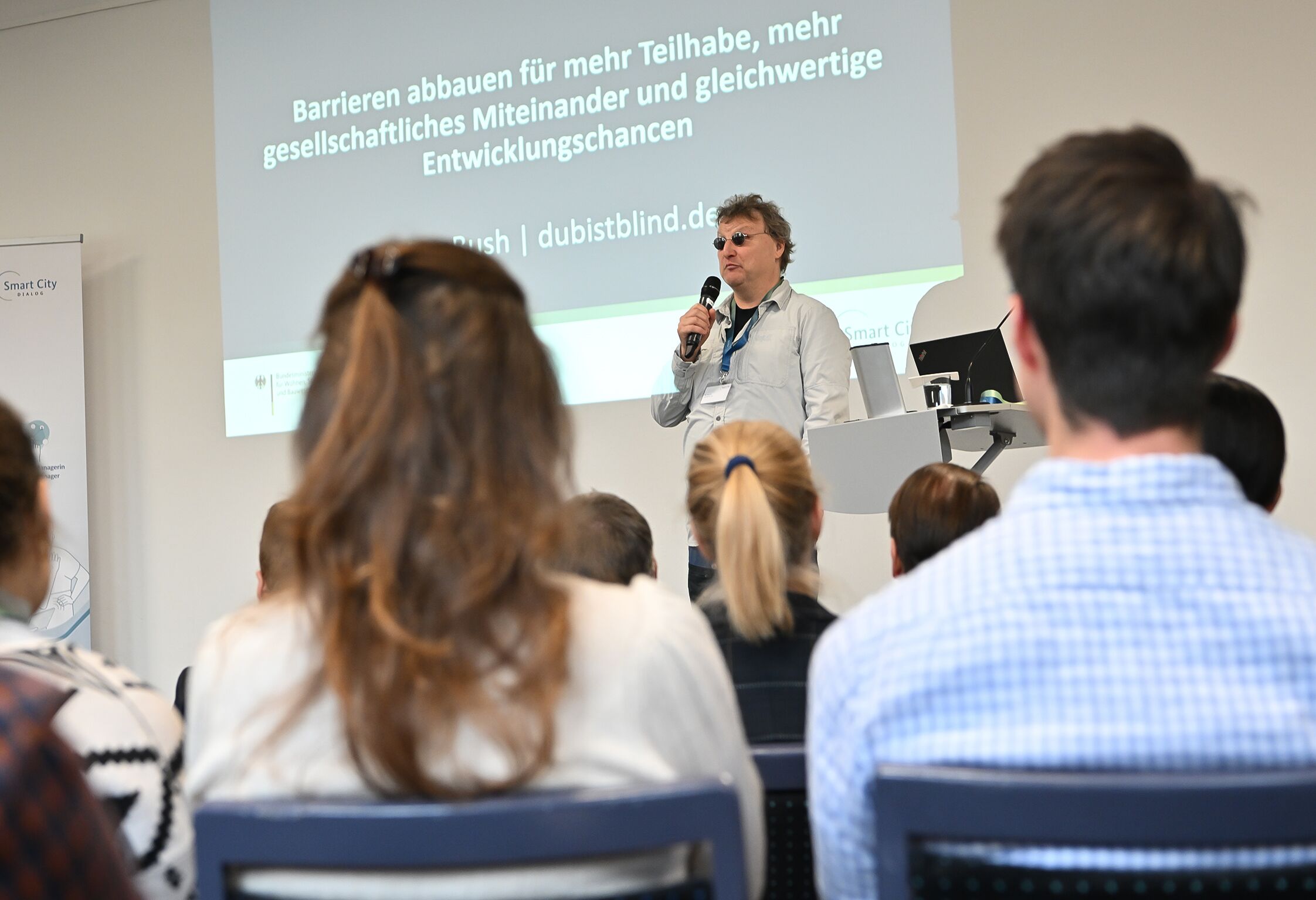 Per Busch, Begründer der Plattform dubistblind.de und Ideengeber zum sogenannten Fernassistenz-Projekt für blinde und seheingeschränkte Menschen, plädierte in seinem Impuls  dafür, eher von „Zugänglichkeit“ als von „Barrierefreiheit“ zu sprechen. Wichtig sei es zudem, Berührungsängste zu überwinden und Menschen mit Behinderungen als Expertinnen und Experten in Beteiligungsformate mit einzubeziehen.
