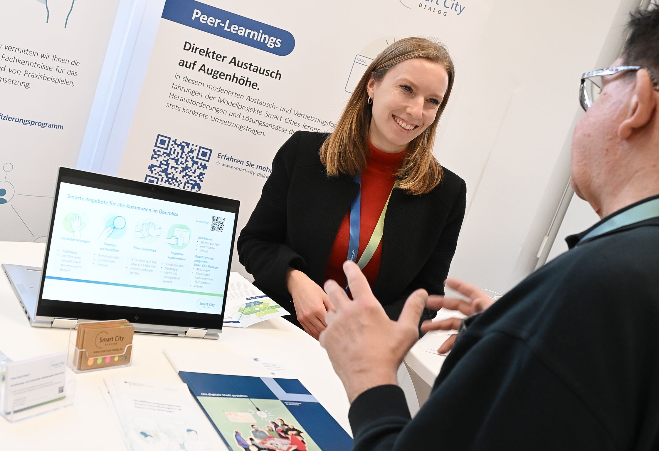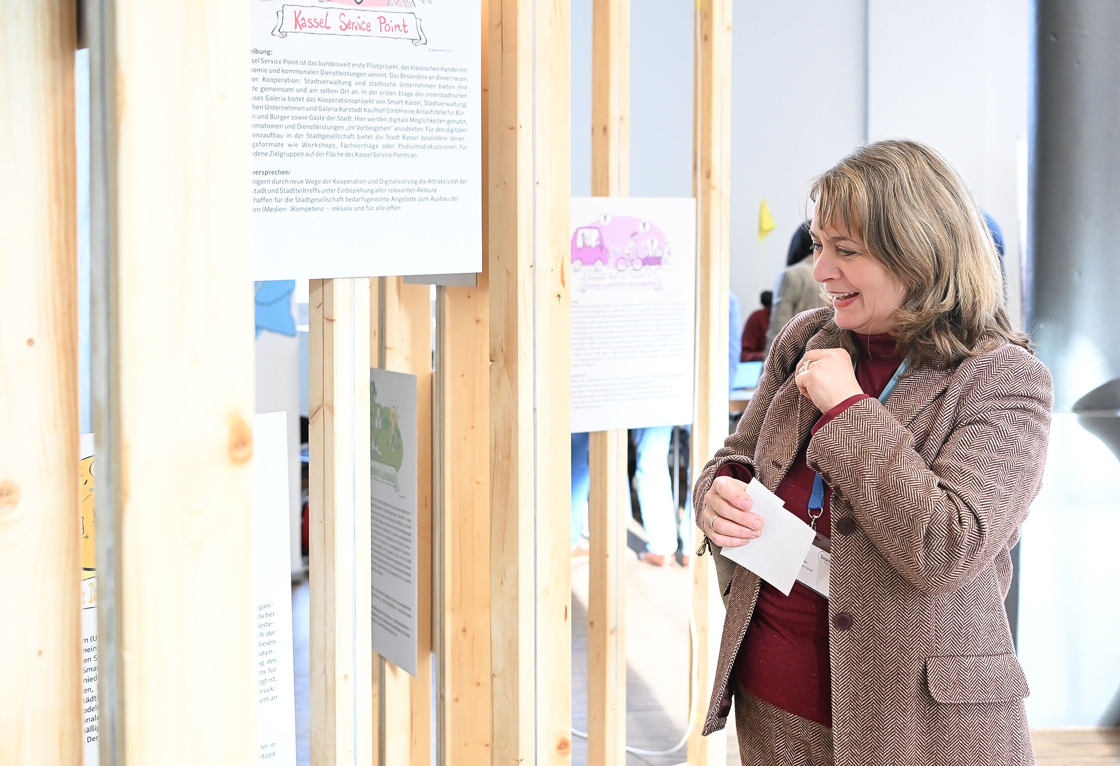 Eine Teilnehmerin informiert sich auf dem „Markt der Möglichkeiten“ zum Angebot der „Smart Service Points“ der Stadt Kassel. Harry Soremski