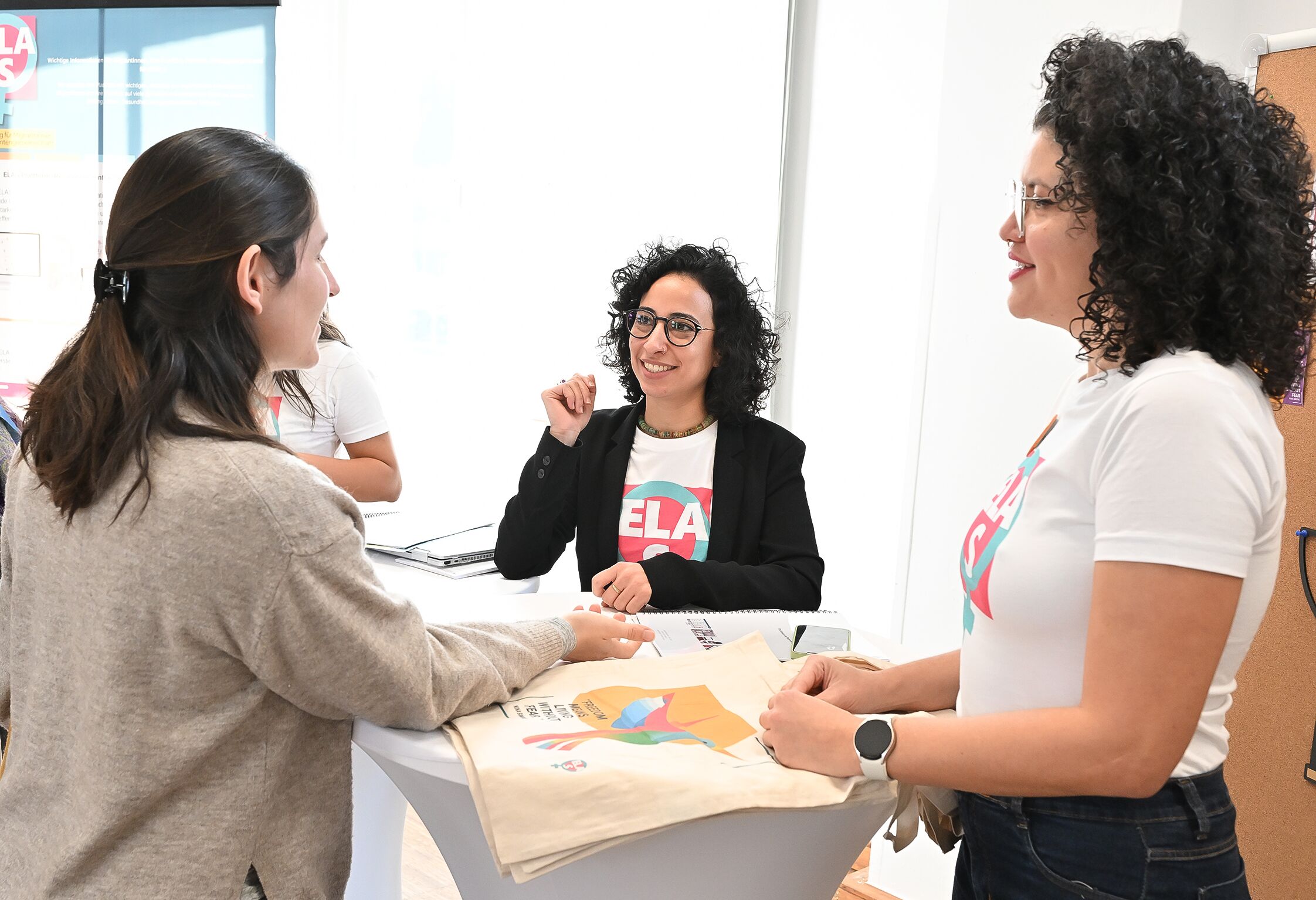 Drei Menschen unterhalten sich vor einem Tisch in einem Ausstellungsraum