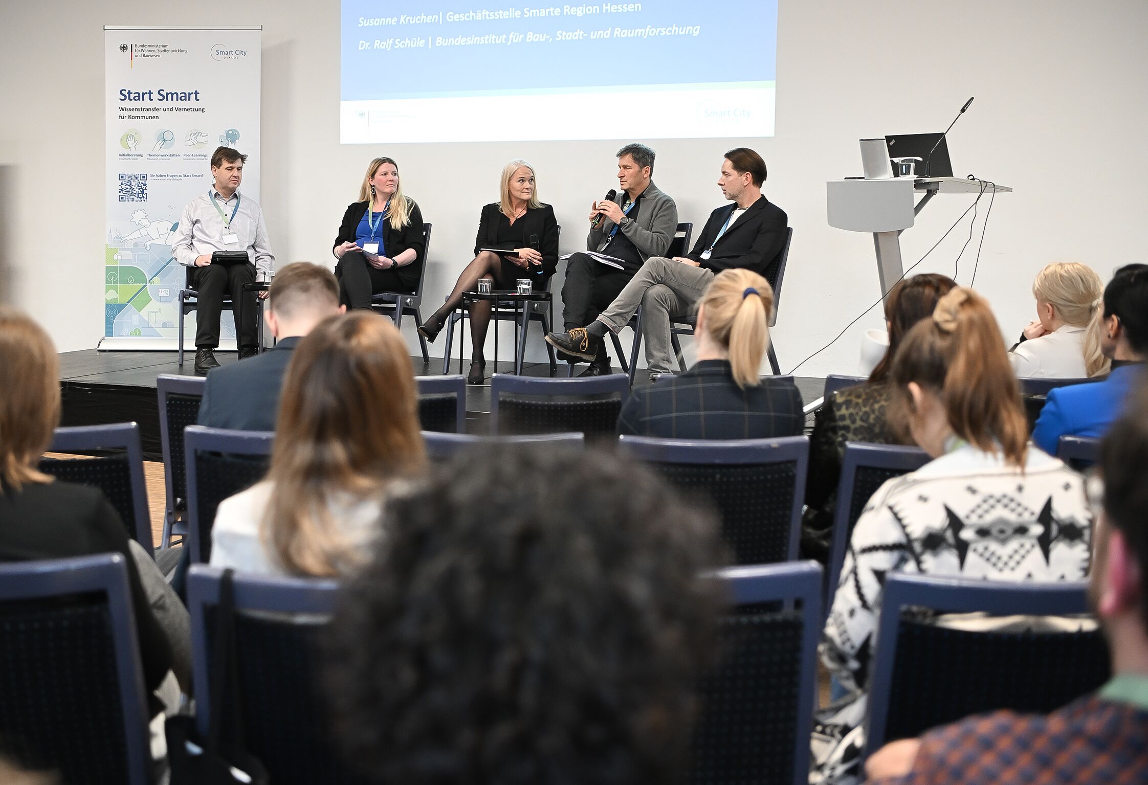 Wie kommt das Digitale zu den Menschen, die es brauchen? Oder der Mensch zu den digitalen Hilfsangeboten? Um Fragen wie diese ging es in der abschließenden Podiumsdiskussion. Unter der Frage: „Nimmt die Smart City alle mit?“ diskutierten Ralf Schüle, Bundesinstitut für Bau-, Stadt- und Raumforschung, Carsten Mauritz, Modellprojekt Smart Cities Kassel, Susanne Kruchen, Geschäftsstelle Smarte Region Hessen und Thomas Krämer, Vizepräsident Deutscher Blinden- und Sehbehindertenverband e.V. über Chancen und Herausforderungen inklusiver Digitalisierung