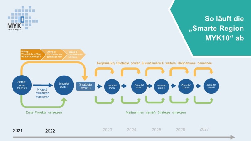 Parallel zum Aufbau der Projektstrukturen streben wir einen kontinuierlichen und periodischen Beteiligungsprozess aus wiederkehrenden kommunikativen Formaten an, um gemeinsam mit der gesamten Region die Zukunftsaufgaben anzugehen. Dazu gehören unter anderem Kommunaldialoge, Zukunftsforen als messeähnliche Formate, Bürgerwerkstätten sowie der Austausch auf der Projektseite http://www.myk10.de.