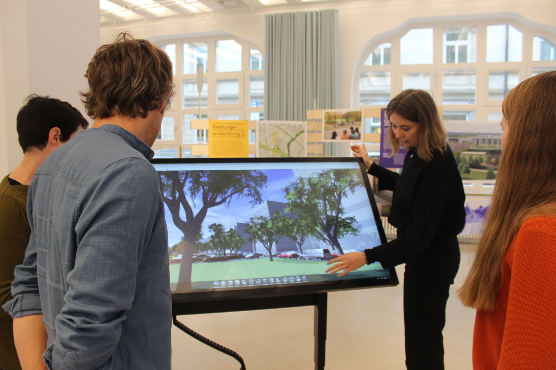 Eine Gruppe von Menschen steht um einen Touchtisch mit einer Stadtplanung.