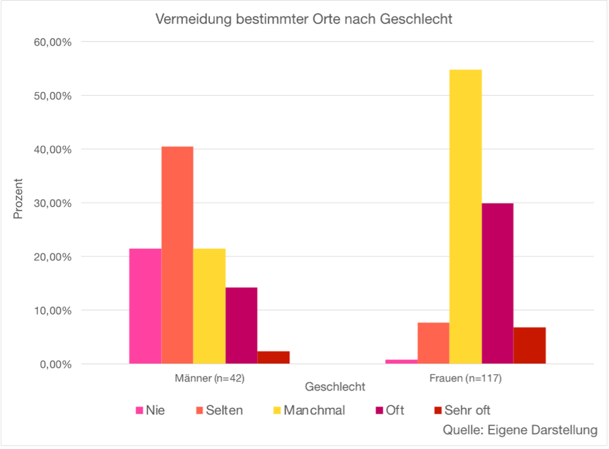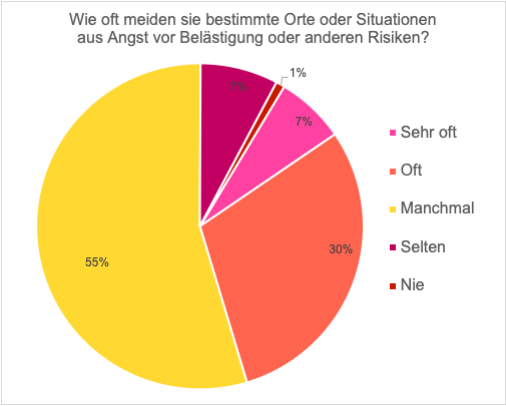 Eine besonders deutliche Zahl spiegelt das offensichtliche Vermeidungsverhalten vieler Frauen wider: Über 90 % unserer Onlineumfrage gaben an, bestimmte Orte oder Situationen zumindest manchmal zu meiden – nachts, in Parks, an schlecht einsehbaren Wegen oder wenig frequentierten Haltestellen. Zur Veranschaulichung der Umfrageergebnisse zwei Grafiken: