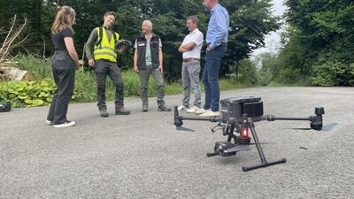Ein Drohnenflug über einen Teilbereich des Stadtwaldes (500 ha) der Kommune sammelt Bildmaterial und LiDAR-Daten über die Forstbestände. Diese Daten geben Informationen über die Einzelbäume (Stückzahl, Baumart, Baumhöhe) und deren Vitalität (Vitalitätsstu-fe, Mistelbefall). Diese können digital an die städtischen Baumpfleger*innen und Förster*innen weitervermittelt werden.