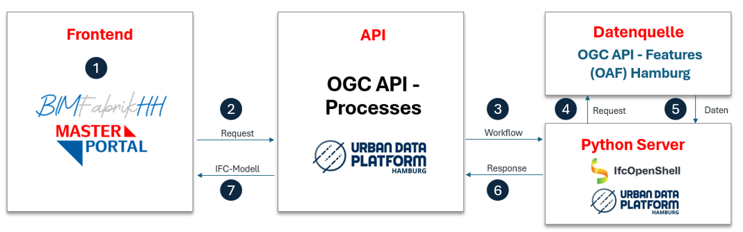 Die BIMFabrikHH steht nicht für sich allein, sondern integriert sich in das bestehende technische Ökosystem des Masterportals. Als Ergänzungsfunktion im Masterportal steht sie unmittelbar allen zur Verfügung, die bereits das Masterportal nutzen. Die Daten, auf die die BIMFabrikHH im Moment zurückgreift, liegen auf der urbanen Datenplattform Hamburg. Die Dateien, die durch die BIMFabrikHH entstehen, lassen sich wiederum auf den eigenen PC downloaden oder im BIMViewer verwenden, der ebenfalls Teil des Masterportals ist.