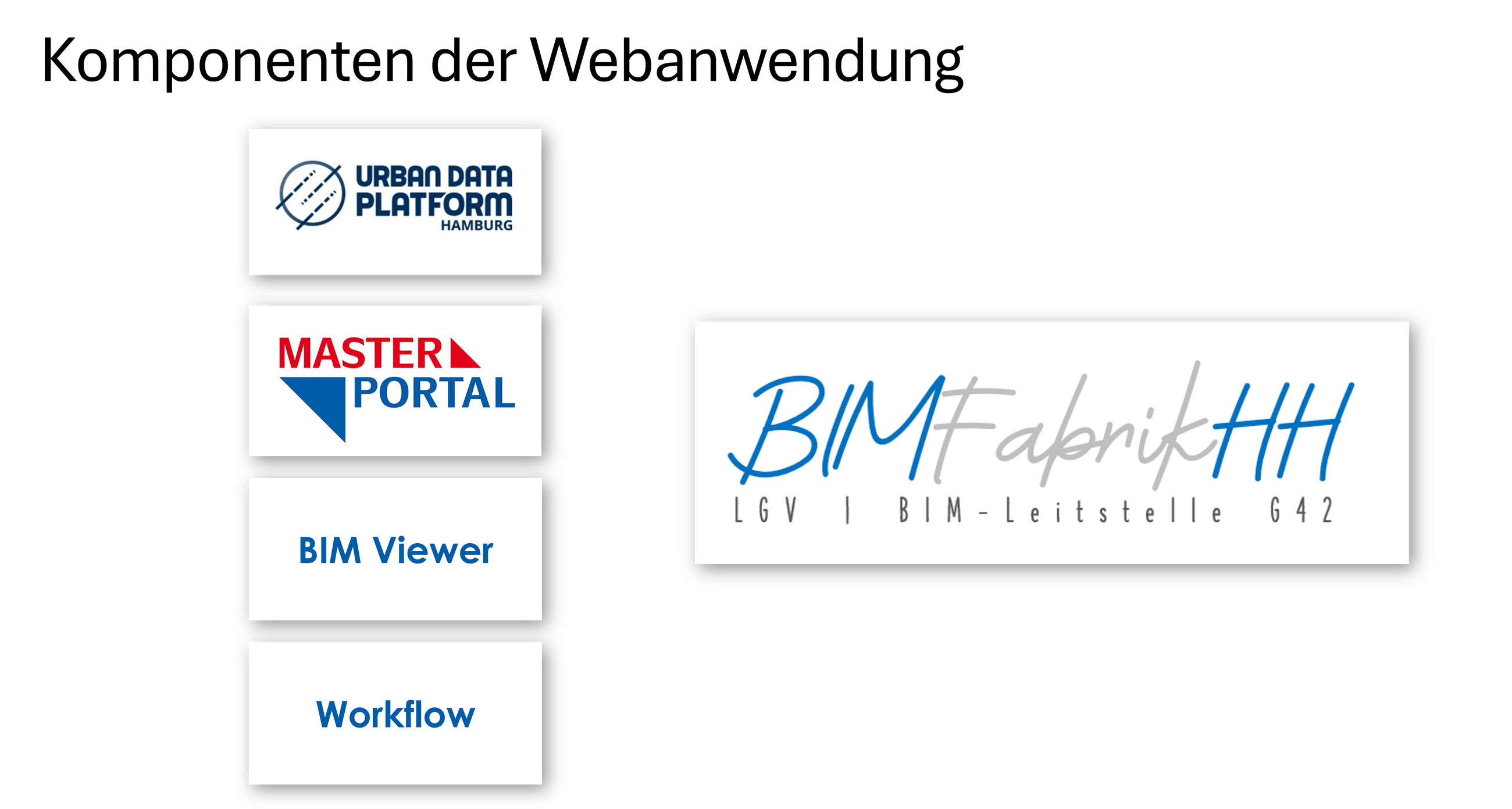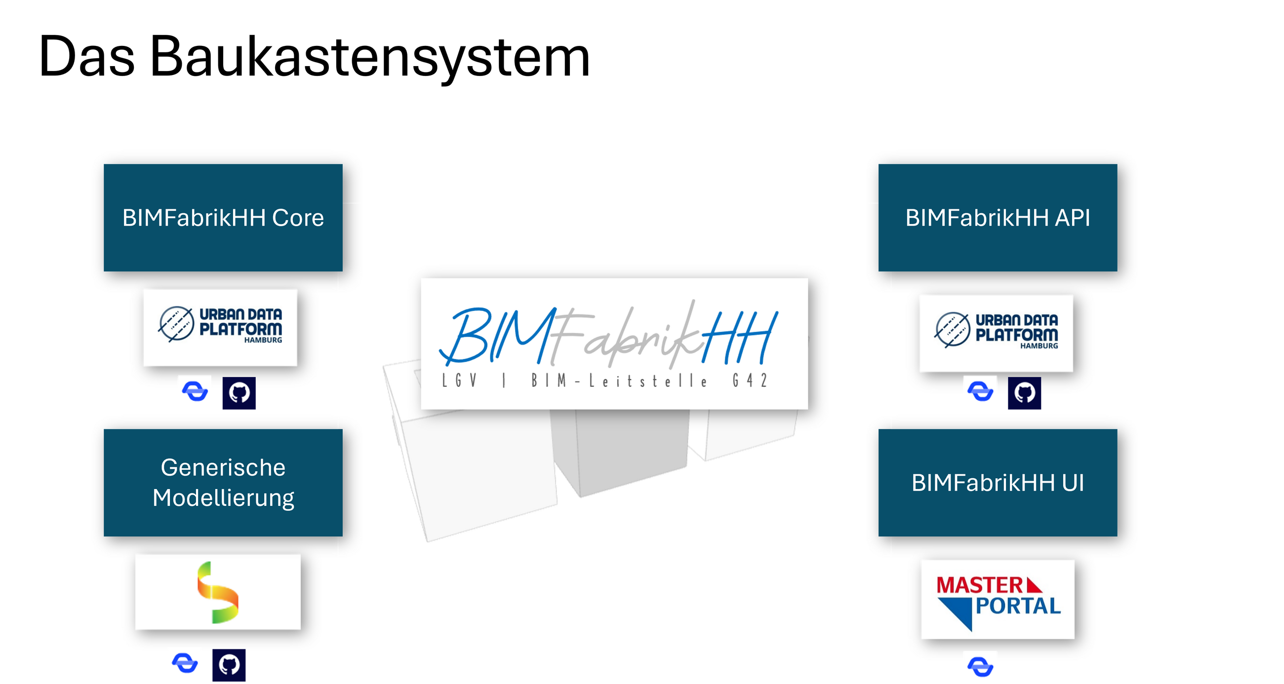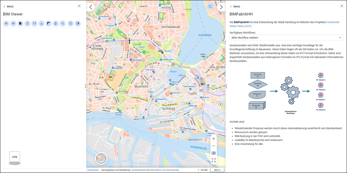 Die BIMFabrikHH ist eine Erweiterungsfunktion für das Masterportal, das als Open-Source-Geoportal in einer Implementierungspartnerschaft unter Federführung der Freien und Hansestadt Hamburg entwickelt wird. Im Masterportal können Nutzerinnen und Nutzer ein Projektgebiet auswählen und sich die umgewandelten GIS-Daten für dieses Gebiet ausgeben lassen. Die neu erstellten Daten lassen sich im BIMViewer, der ebenfalls im Masterportal integriert ist, einsehen.