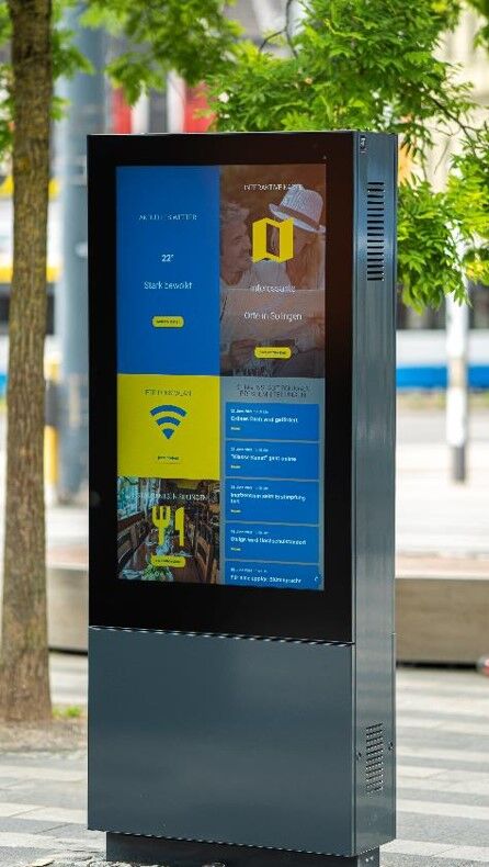 Statt auf statische Informationstafeln und traditionelle Stadtkarten setzt die  Smart City Solingen auf  digitale Stelen, die „Open Smart City Screens“, die seit 2019 im Stadtgebiet aufgestellt werden. Die Stelen bestehen aus einem Bildschirm zur Anzeige von Informationen sowie einer interaktiven Touch-Oberfläche. Sie bieten den Einwohnerinnen und Einwohnern sowie Touristinnen und Touristen einen schnellen und unkomplizierten Zugang zu aktuellen städtischen Informationen von ÖPNV-Verbindungen über Spielplatz-Standorte bis zu Wanderwegen. Die Daten der Stelen können dabei in Echtzeit auf das persönliche Endgerät von Nutzerinnen und Nutzern übertragen werden.