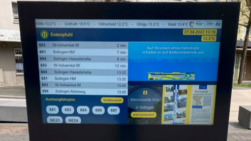 Das Besondere: Die Open Smart City Screens sind ein integraler Bestandteil des Solinger Smart-City-Ökosystems (zusammengeführte Daten- Auswertungs- und Sensorsysteme) und nutzen eine Open-Source-Software. Über eine zentrale Datenplattform sind sie mit weiteren Anwendungen wie der ,,Mensch, Solingen!"-App vernetzt, was eine nahtlose Integration ermöglicht. Dadurch entsteht ein vielseitiger Kommunikationskanal zur Stadtgesellschaft, der auch in Krisensituationen eine wichtige Rolle spielen kann.