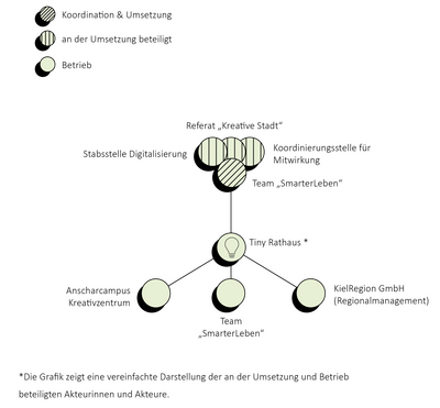 Das Team des Modellprojektes „SmarterLeben“ (ehemals “Smarte KielRegion”) ist für die Durchführung der Maßnahme Tiny Rathaus verantwortlich. Die Projektgelder finanzieren auch das Community Management, das die Planung der Standorte und die Einweisung der Nutzerinnen und Nutzer vor Ort übernimmt. Für eine erfolgreiche Umsetzung berücksichtigt das Team Schnittstellen zum Referat Kreative Stadt, das Expertise zur Kieler Kultur und Kreativwirtschaft einbringt. Die Koordinierungsstelle für Mitwirkung verbindet Politik, Verwaltung und Zivilgesellschaft und unterstützt bei Öffentlichkeitsarbeit und Beteiligungsverfahren. Die Stabsstelle Digitalisierung (OB.D) dient als zentrale Anlaufstelle für digitale Transformation in Kiel und wird beratend hinzugezogen.