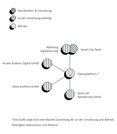Die Zusammenarbeit zur Entwicklung und Implementierung der urbanen Datenplattform basiert auf einem kontinuierlichen Austausch innerhalb der Stadtverwaltung sowie mit externen Technologiepartnern. Innerhalb der Verwaltung findet alle zwei Wochen ein Abstimmungstreffen in der Abteilung „Digitalisierung“ statt, die sowohl für die Smart-City-Entwicklung als auch für die Verwaltungsdigitalisierung zuständig ist.