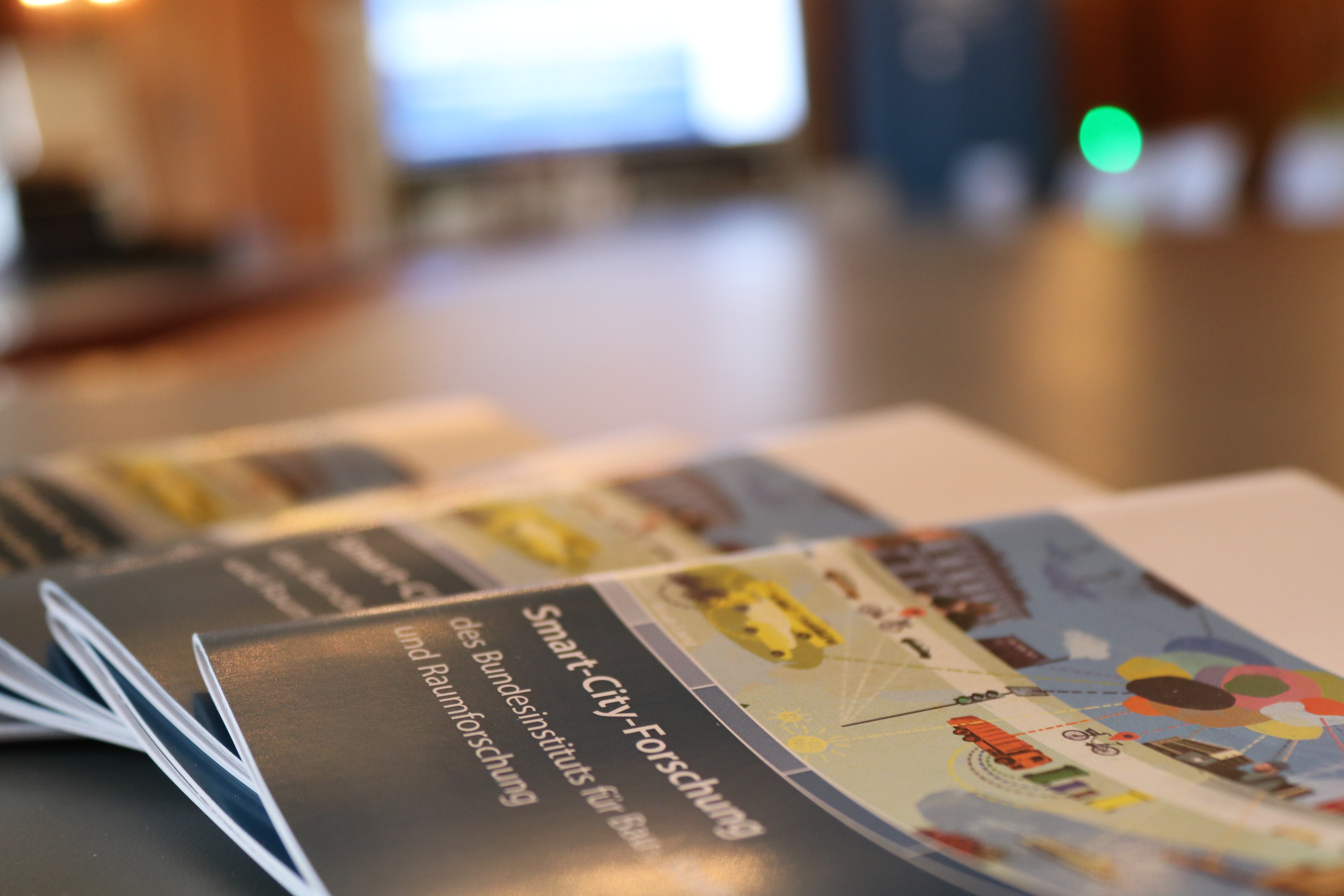 Broschüren zur Smart-City-Forschung liegen auf einem Tisch aus